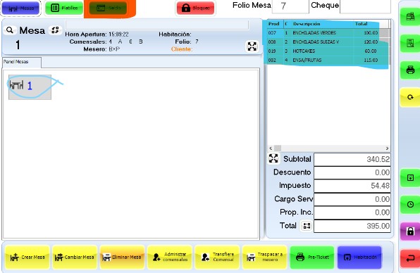 Aqui tenemos nuestra mesa, nuestros 4 comensales, entonces selccionamos en la parte superiror el boton de saldo.