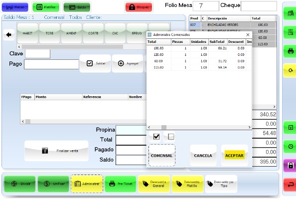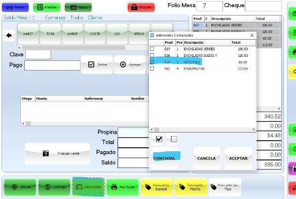 Aqui nos pregunta a que comensal se va asignar el platillo seleccionamos en este ejemplo lo queremos asignar al comensal #1 despues repetimos los pasos y entonces ponemos #3 y aceptar